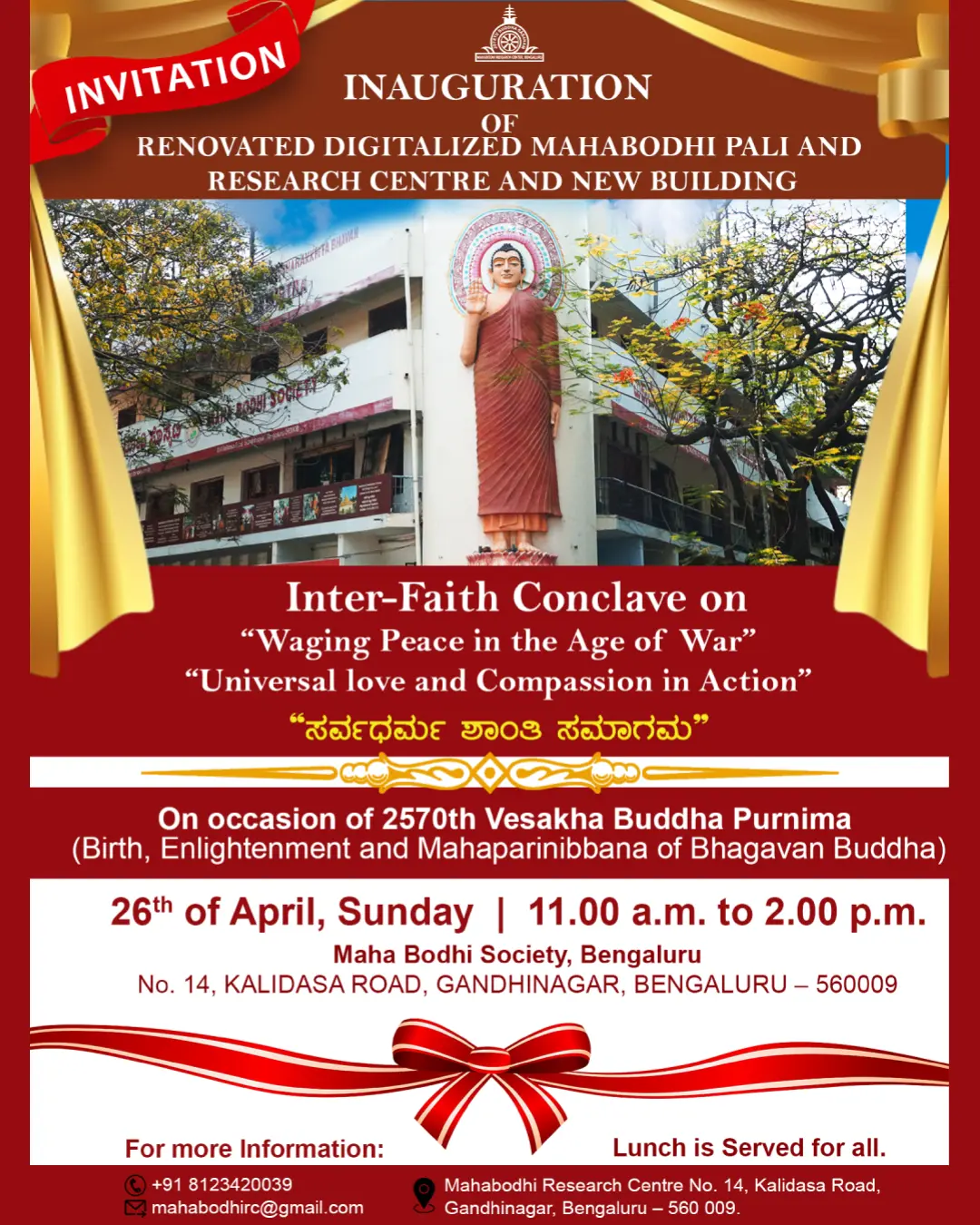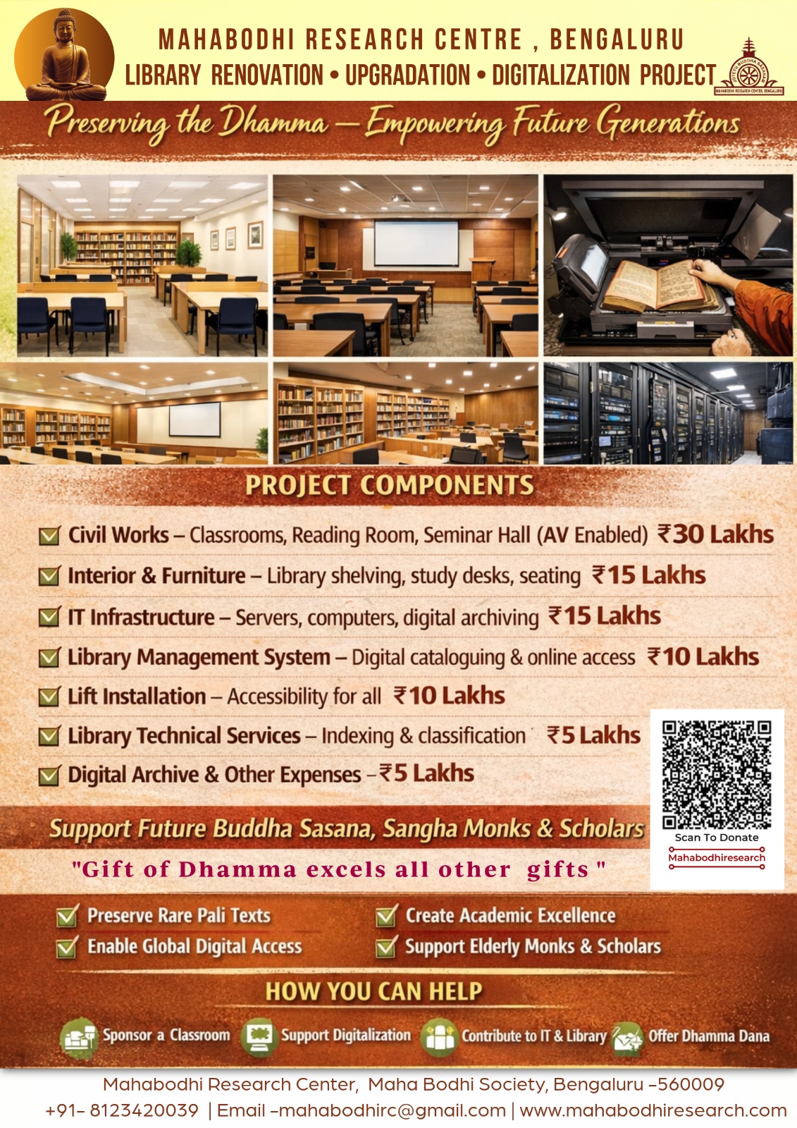 The Mahabodhi Research Centre, Bengaluru, has initiated a major project to renovate, modernize, and digitalize its library, creating a vibrant centre for Pali and Buddhist learning, research, And preservation and propagation of the sacred Buddha-Vachana for future generations.